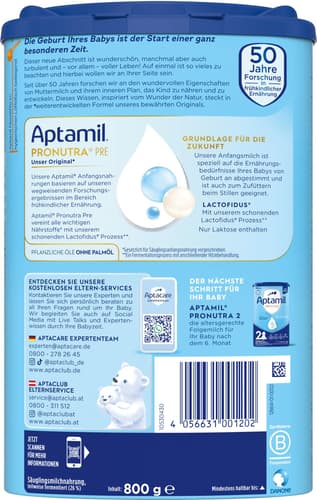 Mit über 50 Jahren Forschung zur frühkindlichen Ernährung bietet Aptamil Pronutra Pre eine hochwertige Anfangsmilch für die ersten Monate des Babys. Aptamil Pronutra Pre vereint unsere einzigartige Nährstoffkombination mit unserem schonenden Lactofidus®️ Prozess. Die Anfangsmilch ist auch zum Zufüttern beim Stillen geeignet. Aptamil Pre enthält pflanzliche Öle ohne Palmöl.