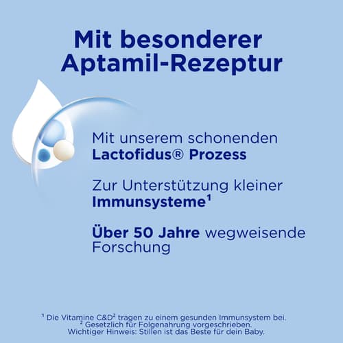 Aptamil Pronutra 2 vereint unsere einzigartige Nährstoffkombination mit unserem schonenden Lactofidus Prozess und stärkt schon die kleinsten Immunsysteme** mit Vitamin C und D***. Unsere Folgenahrung ist optimal auf die Ernährungsbedürfnisse deines Babys ab dem 6. Monat als Bestandteil einer gemischten Ernährung mit Beikost abgestimmt. Sie enthält pflanzliche Öle ohne Palmöl und keine Stärke.