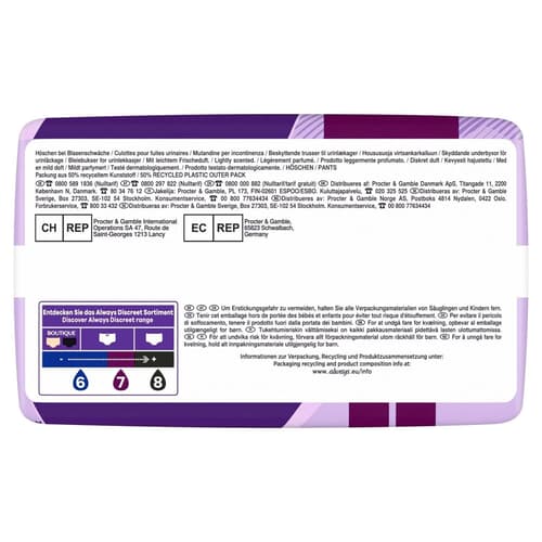 Bladder weakness doesn't have to mean putting your life on hold. With Always Discreet Incontinence Underwear for Women in size L, you can continue with your day as normal even when you experience moderate to heavy leaks caused by sudden urges and need protection that stays securely in place. The super absorbent underwear features RapidDry technology that locks away bladder leaks and odours in seconds. The double leak guards help stop leaks where they happen most. The 360° FormFit design and comfortable waistband provide a soft and smooth fit, so you can move with confidence while experiencing incredible discretion. Try Always Discreet Incontinence Underwear Plus L. Also suitable for postpartum incontinence. For a black panty and incredible protection, try our Always Discreet Boutique Underwear.