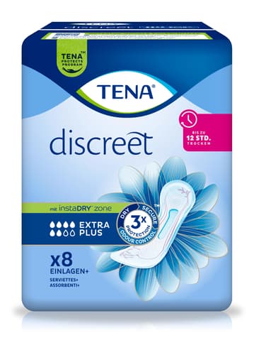 TENA Lady Discreet Extra Plus Inkontinenzeinlagen bieten maximalen Schutz bei mittlerer bis schwerer Blasenschwäche. Die InstaDRY™ Technologie saugt Flüssigkeit sofort auf und der superabsorbierende Kern schließt diese verlässlich im Inneren der Einlage ein, weg von der Haut. Für langanhaltende Trockenheit bis zu 12 Stunden.