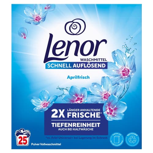 Lenor Waschmittel Pulver Aprilfrisch (25WL)1.5 kgThis product is no longer available.Country: according to the current offerplease contact customer support for the exact information
