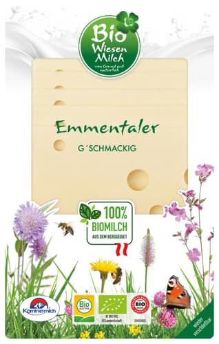 Verkehrsbezeichnung und Gewicht: Bio Wiesenmilch Emmentaler, 100g in Scheiben.