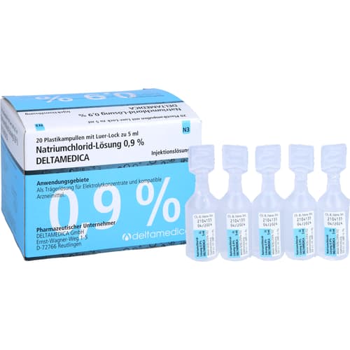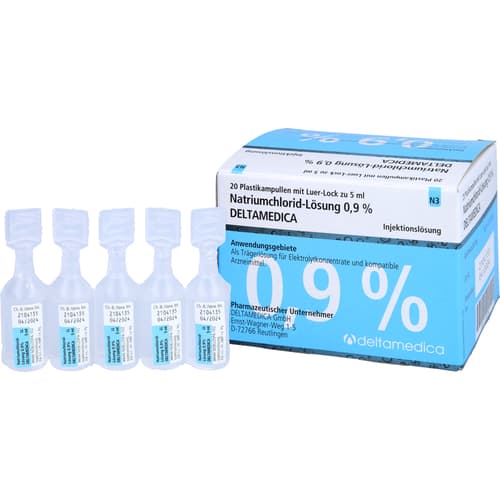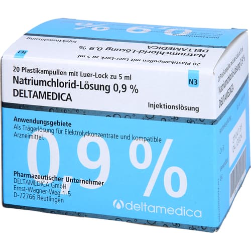 Isotonische Natriumchlorid-Lösung 0,9% Deltamedica Infusionslösung. Wirkstoff: Natriumchlorid. Anwendungsgebiete: Flüssigkeits- und Elektrolytsubstitution bei hypochlorämischer Alkalose, Chloridverluste, kurzfristiger intravasaler Volumenersatz, hypotone Dehydration, isotone Dehydration.Quelle: Angaben der Verpackung