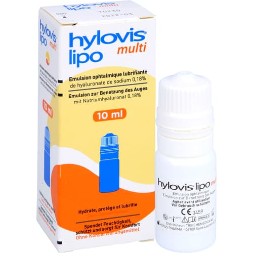 Hylovis Lipo multi ist ein Tränenersatzmittel, das als sterile, hypoosmolare Emulsion mit 0,18 % Natriumhyaluronat (aus Fermentation), verpackt in einem 10 ml Multidosis Fläschchen, angeboten wird und frei von Konservierungsstoffen istHylovis Lipo ist eine Emulsion, die den Tränenfilm stabilisiert. Hylovis Lipo enthält Natriumhyaluronat, ein Bestandteil, der natürlicherweise im Auge vorkommt und zum Schutz und zur Befeuchtung der Augenoberfläche beiträgt. Dank der physikalischen Eigenschaften von Natriumhyaluronat hat Hylovis Lipo eine stark wasserbindende Wirkung und gute viskoelastische Eigenschaften, durch die ein gleichmäßiger, schützender Gleitfilm an der Oberfläche des Auges entsteht. Auf diese Weise wirkt das Produkt auf die wässrige Schicht, um die Augenoberfläche mit Feuchtigkeit zu versorgen und zu schützen. Hylovis Lipo ist hypoosmolar, um die schädlichen Reaktionen (Entzündungen) als Folge der Hyperosmolarität des Tränenfilms bei Augentrockenheit auszugleichen. Natriumhyaluronat besitzt auch mukomimetische Eigenschaften, durch die Hylovis Lipo die Stabilität des Tränenfilms unterstützt. Für eine optimale Verträglichkeit enthält Hylovis Lipo keine Konservierungsstoffe oder Tenside.