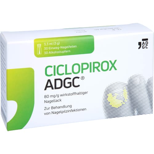 Ciclopirox ADGC 80 mg/g wirkstoffhaltiger Nagellack. Wirkstoff: Ciclopirox. Anwendungsgebiete: zur Behandlung von Nagelpilzinfektionen (Onychomykosen).Quelle: Angaben der Packungsbeilage