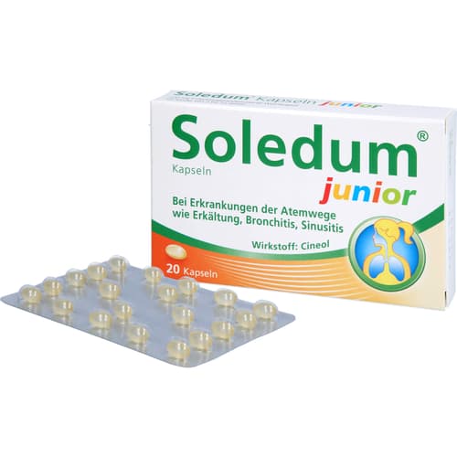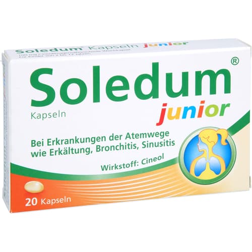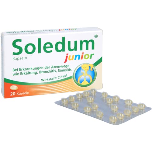 Soledum Kapseln junior 100 mg, magensaftresistente Weichkapseln. Wirkstoff: Cineol. Anwendungsgebiete: zur Behandlung der Symptome bei Bronchitis und Erkältungskrankheiten der Atemwege und zur Zusatzbehandlung bei chronischen und entzündlichen Erkrankungen der Atemwege (z.B. der Nasennebenhöhlen).Zu Risiken und Nebenwirkungen lesen Sie die Packungsbeilage und fragen Sie Ihre Ärztin, Ihren Arzt oder in Ihrer Apotheke.