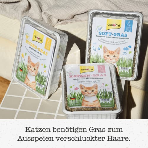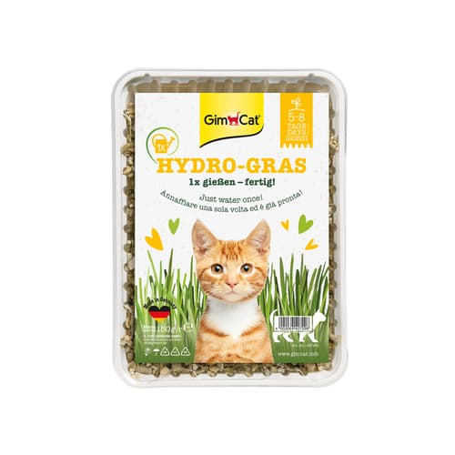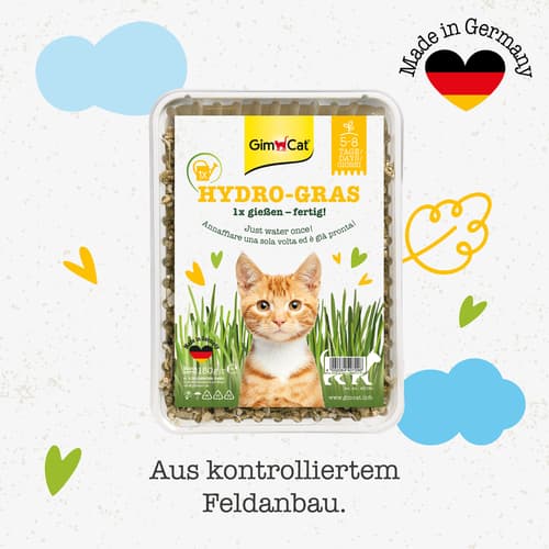 Hydro-Gras enthält wasserspeichernde Hydro-Körnchen, die das ständige Nachgießen von Wasser überflüssig machen. Gebrauchsanweisung 1. So einfach geht's: Füllen Sie die Grasschale einmal randvoll mit lauwarmem Wasser. Das Wasser sollte gleichmäßig über den Inhalt verteilt werden, so dass der Schaleninhalt und das eingefüllte Wasser den Schalenrand erreichen. Bitte kein Wasser ausschütten, denn nach wenigen Minuten haben die wasserspeichernden Hydro-Körnchen bereits das gesamte Wasser aufgenommen! 2. Stellen Sie die Schale an einen hellen und warmen Ort (z.B. Fensterbank). Extreme Hitzeeinwirkung (direkte Sonneneinstrahlung, Heizkörper, etc.) sind zu vermeiden. 3. Nach 5-8 Tagen wird das Hydro-Gras eine Höhe von etwa 5 cm erreicht haben. Damit es länger frisch bleibt und die volle Grasdichte erreicht, sollten Sie jetzt nochmals 1 Tasse Wasser (ca. 150 ml) über das Gras verteilen. Danach können Sie Ihre Katze damit verwöhnen. Tipps und Hinweise Katzen suchen häufig nach frischem Grün als Ergänzung. Dieses Grün kann leicht von Zimmerpflanzen gewonnen werden, was allerdings manchmal ungewünscht ist. Um das zu verhindern, können Sie Ihrer Katze GimCat Hydro-Gras anbieten. GimCat Hydro-Gras liefert das Gras, das Ihrer Katze hilft, verschluckte Haare auf natürliche Weise loszuwerden. Bitte beachten Sie, dass in der kalten Jahreszeit eine Unterlage aus Zeitung o.ä. wichtig ist, da die Fensterbänke sehr kalt sein können. Auch Metallfenster strahlen Kälte aus. Das wiederum ist für das Wachstum des Grases nicht förderlich. Die Wachstumsdauer ist stark von Licht- und Temperaturbedingungen abhängig und es kann daher zu unterschiedlicher Aufwuchsdauer kommen (ca. 5-8 Tage). Bieten Sie Ihrer Katze regelmäßig frisches Gras für ihr Wohlbefinden an.