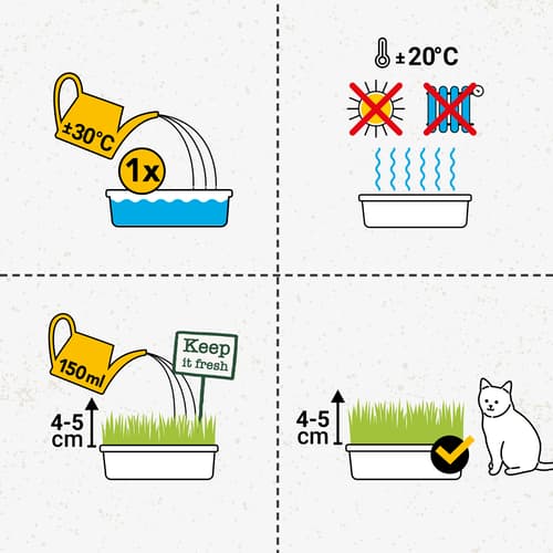 1. So einfach geht's: Füllen Sie die Grasschale einmal randvoll mit lauwarmem Wasser. Das Wasser sollte gleichmäßig über den Inhalt verteilt werden, so dass der Schaleninhalt und das eingefüllte Wasser den Schalenrand erreichen. Bitte kein Wasser ausschütten, denn nach wenigen Minuten haben die wasserspeichernden Hydro-Körnchen bereits das gesamte Wasser aufgenommen! 2. Stellen Sie die Schale an einen hellen und warmen Ort (z.B. Fensterbank). Extreme Hitzeeinwirkung (direkte Sonneneinstrahlung, Heizkörper, etc.) sind zu vermeiden. 3. Nach 5-8 Tagen wird das Hydro-Gras eine Höhe von etwa 5 cm erreicht haben. Damit es länger frisch bleibt und die volle Grasdichte erreicht, sollten Sie jetzt nochmals 1 Tasse Wasser (ca. 150 ml) über das Gras verteilen. Danach können Sie Ihre Katze damit verwöhnen.