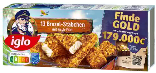 Käpt‘n iglos Brezel-Stäbchen mit Fisch-Filet in einer knusprigen Brezel-Panade (58% Fisch-Filet, 42% Panade).