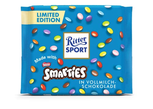 Die Ritter Sport Smarties Vollmilch ist eine Limited Edition, die die zartschmelzende Ritter Sport Vollmilchschokolade mit den bekannten bunten Smarties vereint. Diese Kombination bietet ein Erlebnis aus der cremigen Textur der Schokolade und dem knackigen Biss der Schokolinsen. Die Schokolinsen in den Farben Grün, Blau, Gelb, Rot, Lila und Braun sind dabei von feiner Milchschokolade umgeben und in die Tafel eingebettet. Diese Sorte spricht Schokoladenliebhaber an, die eine spielerische und farbenfrohe Variante der klassischen Vollmilchschokolade suchen.