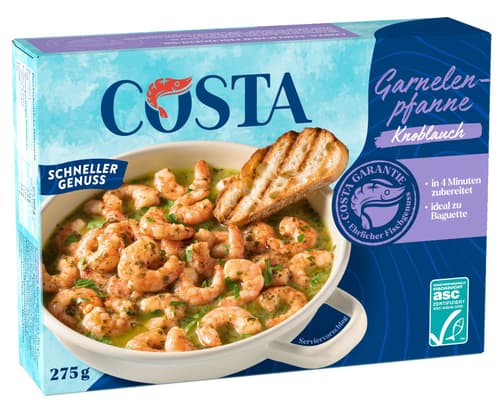 Mit einer Zubereitungszeit von vier Minuten präsentiert COSTA seine erfolgreiche Garnelenpfanne Knoblauch in der 275g Faltschachtel jetzt auch als Teil des neuen Garnelen-Konzepts: Aromatisch würzig, mit Kräutern verfeinert und dank idealem Saucenanteil perfekt zum Dippen mit Baguette oder zu Pasta.