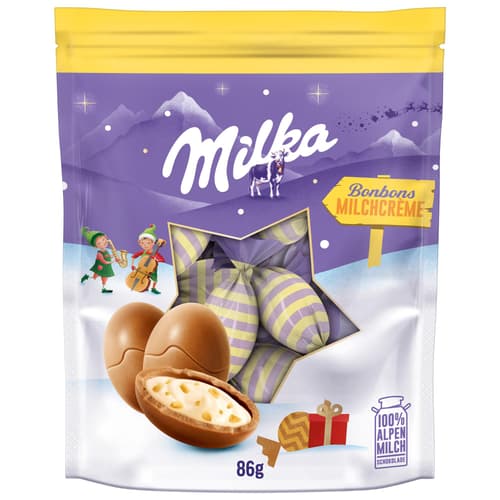 Milka Bonbons Milchcrème 86g sorgen für Spaß auf dem Weihchtsteller: Zartschmelzende Alpenmilch Schokolade außen und feine Milchcrèmefüllung sowie leckere Haselnussstückchen innen - ein Spaß für Groß und Klein. Die Schokoladen Bonbons eignen sich ideal, um damit den Adventskalender der Kinder oder des Partners zu befüllen, sie zum Nikolaus zu verschenken oder den Weihchtsteller mit ihnen anzurich-ten. Die Milka Klassiker gehören einfach zum Fest dazu. Um den leckeren Geschmack der Vollmilchschokolade möglichst lange genießen zu können, sollten die Milka Bonbons Milchcrème am besten kühl und trocken sowie vor Wärme geschützt gelagert werden.