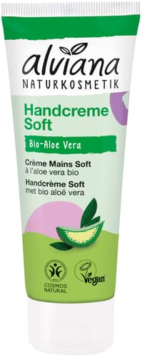 Die alviana Handcreme Soft mit Bio-Aloe Vera Saft zieht schnell ein und pflegt die Hände streichelzart.