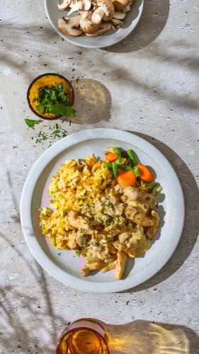 Eine Portion - Knusprige Kartoffelstreifen mit zarter Champignon-Sahne-Sauce, saftigem Hähnchenfleisch und frischem Gemüse – ein herzhaftes Gericht. Offizielles The Taste Partnergericht.