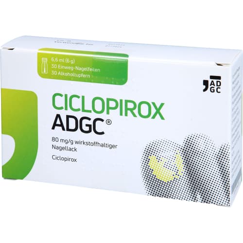 Ciclopirox ADGC 80 mg/g wirkstoffhaltiger Nagellack. Wirkstoff: Ciclopirox. Anwendungsgebiete: zur Behandlung von Nagelpilzinfektionen (Onychomykosen).Quelle: Angaben der Packungsbeilage