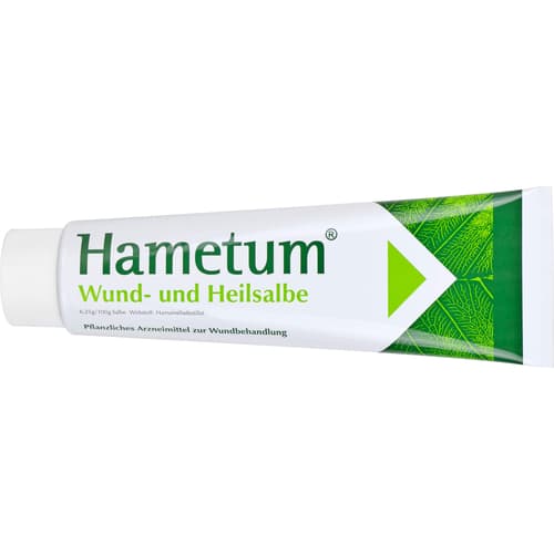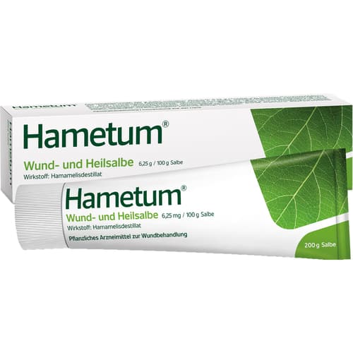 Hametum Wund- und Heilsalbe. Wirkstoff: Hamamelisdestillat. Anwendungsgebiete: bei leichten Hautverletzungen und bei kleinflächigen Entzündungen der Haut und Schleimhäute.Zu Risiken und Nebenwirkungen lesen Sie die Packungsbeilage und fragen Sie Ihre Ärztin, Ihren Arzt oder in Ihrer Apotheke.