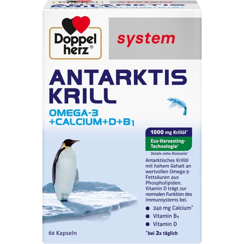 DOPPELHERZ Antarctic Krill System Kapseln sind ein Nahrungsergänzungsmittel aus Deutschland. Jede Packung enthält 60 Kapseln mit wertvollem Krillöl, reich an Omega-3-Fettsäuren, Vitamin B1, Vitamin D und Calcium. Nehmen Sie täglich zwei Kapseln unzerkaut mit Flüssigkeit ein, um Ihre Ernährung optimal zu ergänzen. Ideal für alle, die ihre Nährstoffzufuhr unterstützen möchten und Wert auf Qualität legen.