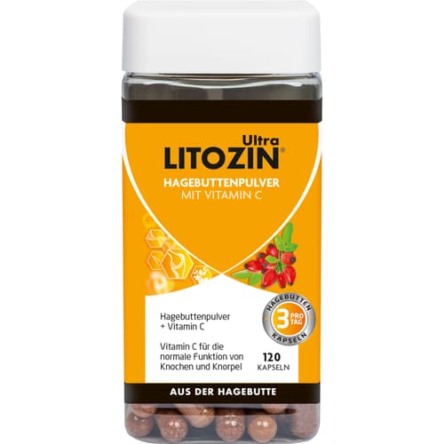 Die Litozin Ultra Kapseln sind ein Nahrungsergänzungsmittel aus Dänemark, das Hagebuttenpulver (83%) und Vitamin C kombiniert. Diese 120 Kapseln (108g) sind frei von künstlichen Farb- und Konservierungsstoffen, Gluten und Laktose. Erwachsene nehmen täglich 3 Kapseln mit Wasser zu einer Mahlzeit ein oder streuen das Pulver über Speisen. Eine ideale Ergänzung für Ihre ausgewogene Ernährung.