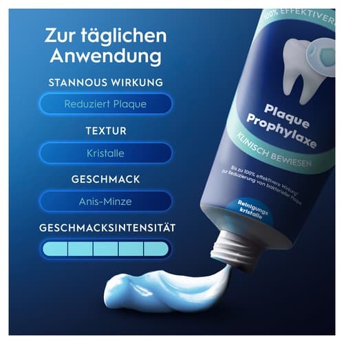 Die Oral-B Professional Plaque Prophylaxe Zahncreme bietet bis zu 100% effektivere Wirkung zur Reduzierung von bakterieller Plaque gegenüber herkömmlicher Fluorid-Zahncreme – klinisch bewiesen und ideal für eine umfassende Mundhygiene. Mit der einzigartigen anti-bakteriellen Technologie und dem Stannous Fluorid Komplex bildet sie einen Rundum-Schutz und sorgt für langanhaltende Frische. Reinigungskristalle sorgen für ein gründliches Reinigungserlebnis, während aktives Zink dabei hilft, bakterielle Plaque zu reduzieren und deren erneutes Wachstum für 24 Stunden zu verhindern – bei zweimal täglicher Anwendung. Erlebe ein sauberes Mundgefühl und zuverlässigen Schutz gegen Plaque.