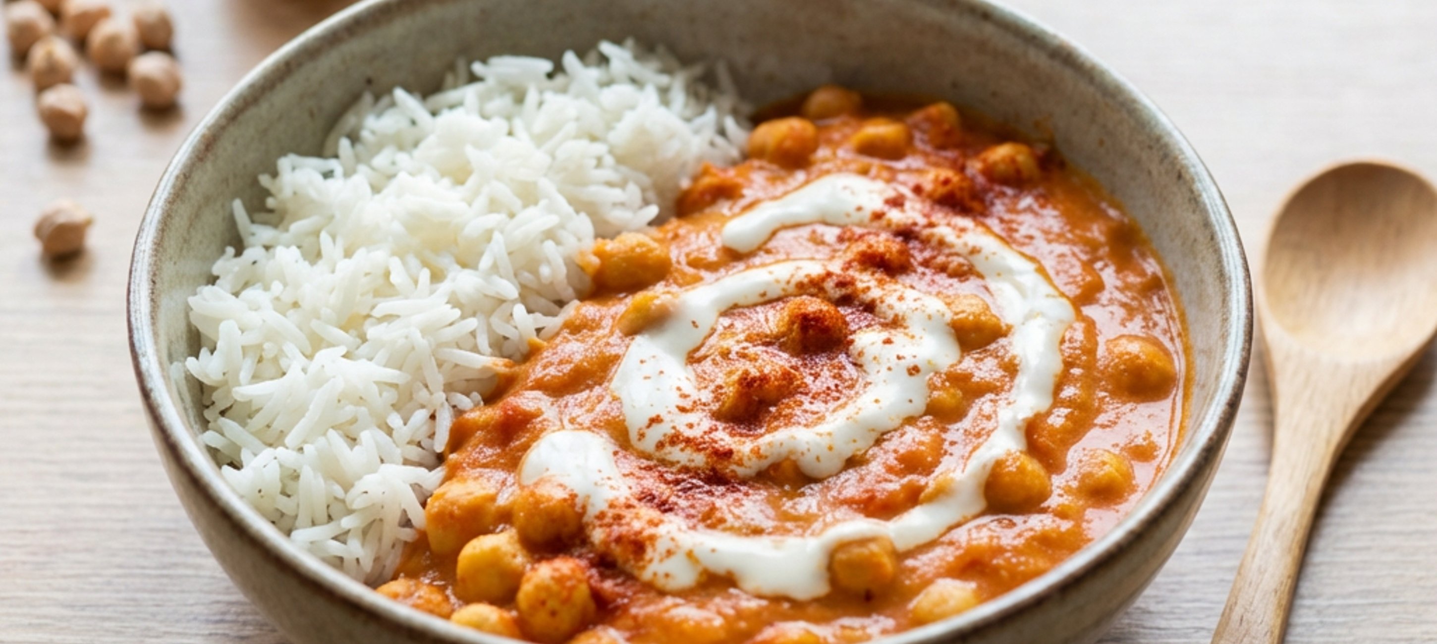 - 3Während der Reis kocht, die Sauce zubereiten. In einer tiefen Pfanne 2 EL Olivenöl erhitzen, die gehackte Zwiebel hinzufügen und ca. 2 Minuten glasig dünsten. Dann 1 EL Tomatenmark, die vorgekochten Kichererbsen und die stückigen Tomaten hinzufügen und alles weitere 5 Minuten anbraten.