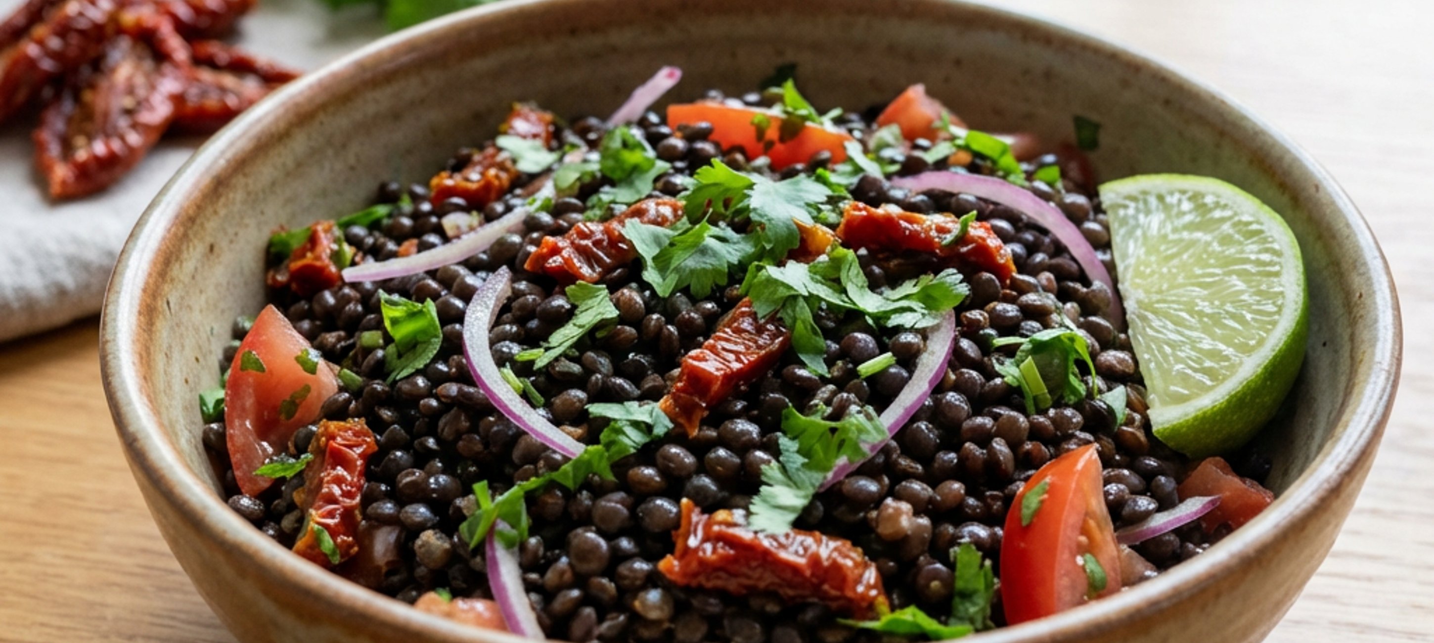 - 3Die gekochten Linsen mit den vorbereiteten Zutaten in einer Schüssel vermengen. Den Salat mit dem Saft einer Limette, Salz und Pfeffer abschmecken.