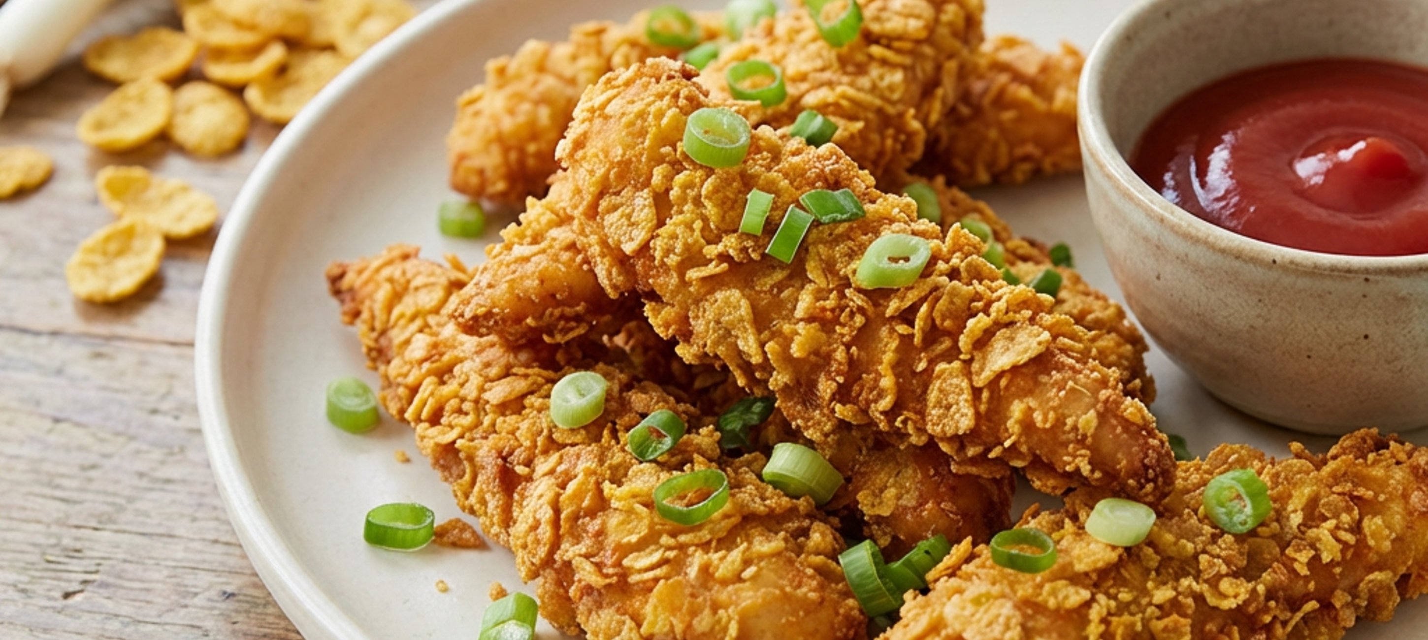 - 4Die fertigen Strips mit in Ringe geschnittenen Frühlingszwiebeln garnieren und servieren. Dazu passt hervorragend ein Dip nach Wahl oder hausgemachter Ketchup.