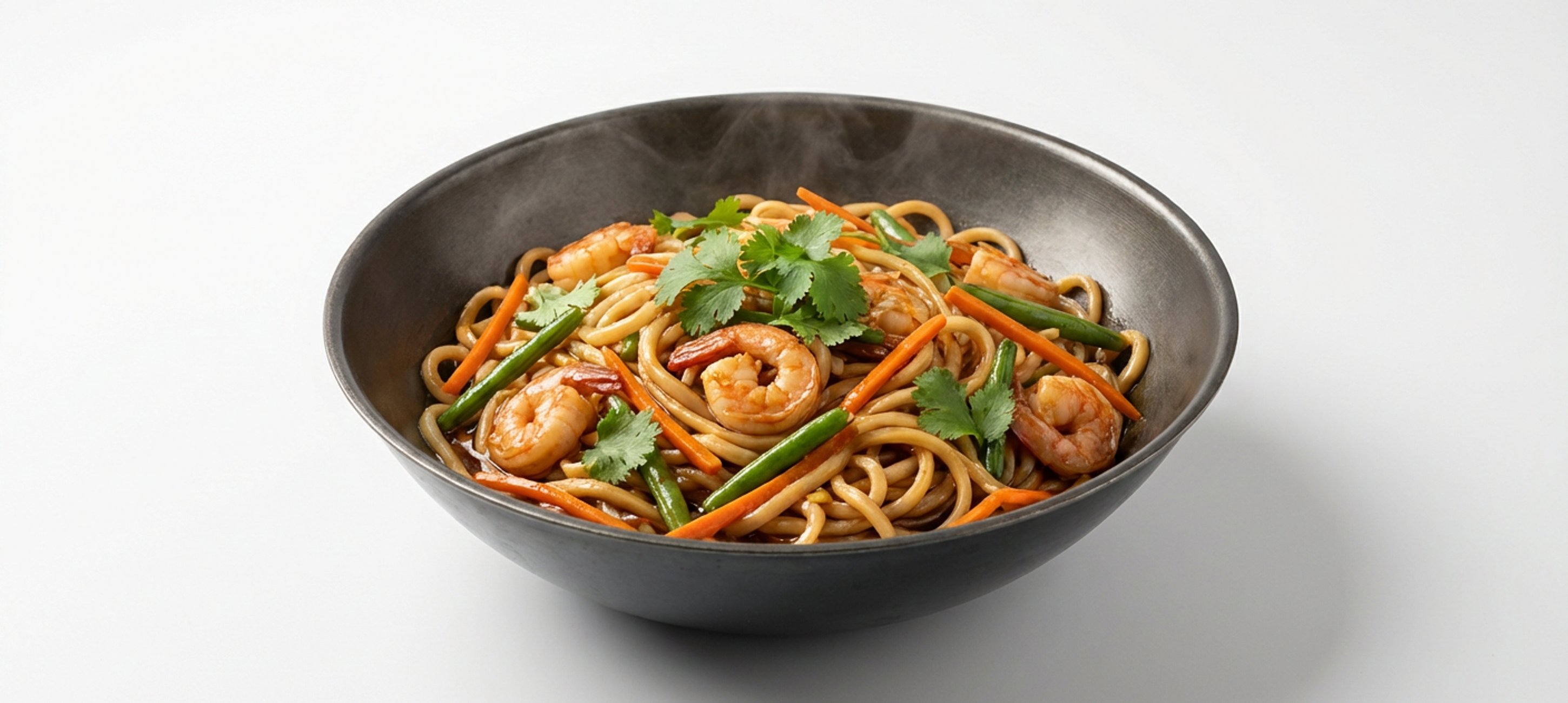 - 5Zum Schluss die vorgekochten Udon-Nudeln hinzufügen. Da diese bereits gar sind, müssen sie nur etwa 1 Minute lang in der Pfanne mit erhitzt werden. Alles gut vermengen, mit frischem Koriander und weißem Sesam bestreuen und sofort servieren.