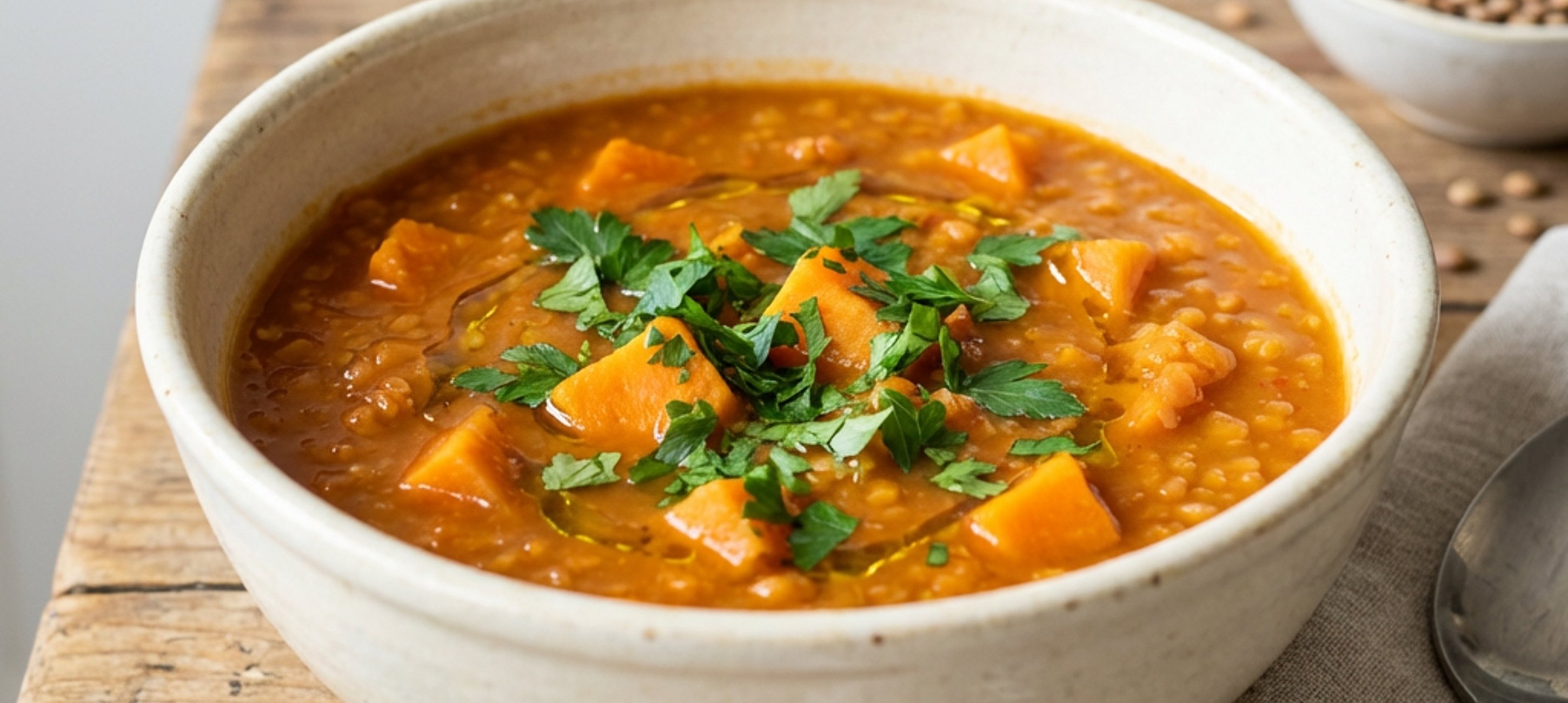 - 3Die Süßkartoffelwürfel hinzufügen und kurz mitdünsten. Die stückigen Tomaten sowie 700 ml kochendes Wasser dazugeben und alles ca. 7 Minuten köcheln lassen. Dann die roten Linsen hinzufügen und bei mittlerer Hitze garen, bis sie weich sind.
