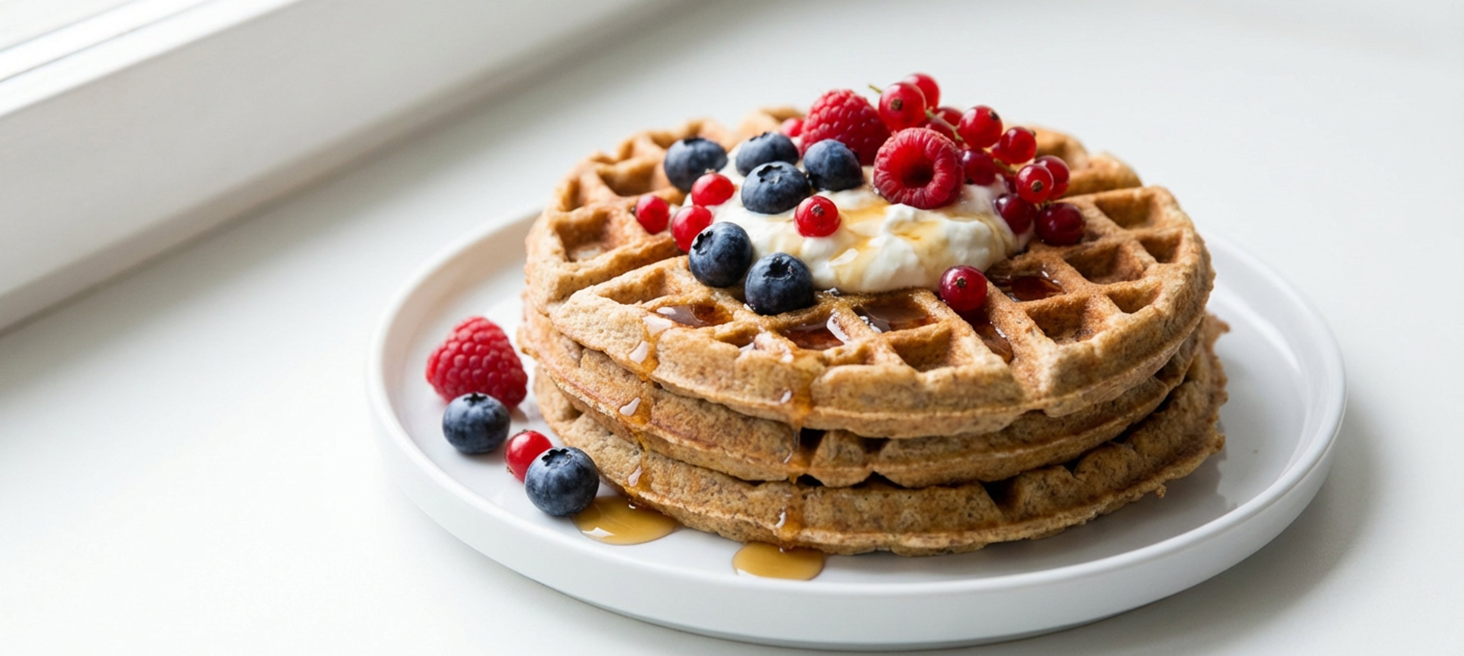 - 3Die warmen Waffeln mit frischen Beeren, einem Klecks Quark oder Joghurt anrichten und mit Ahornsirup beträufeln. Sofort genießen.