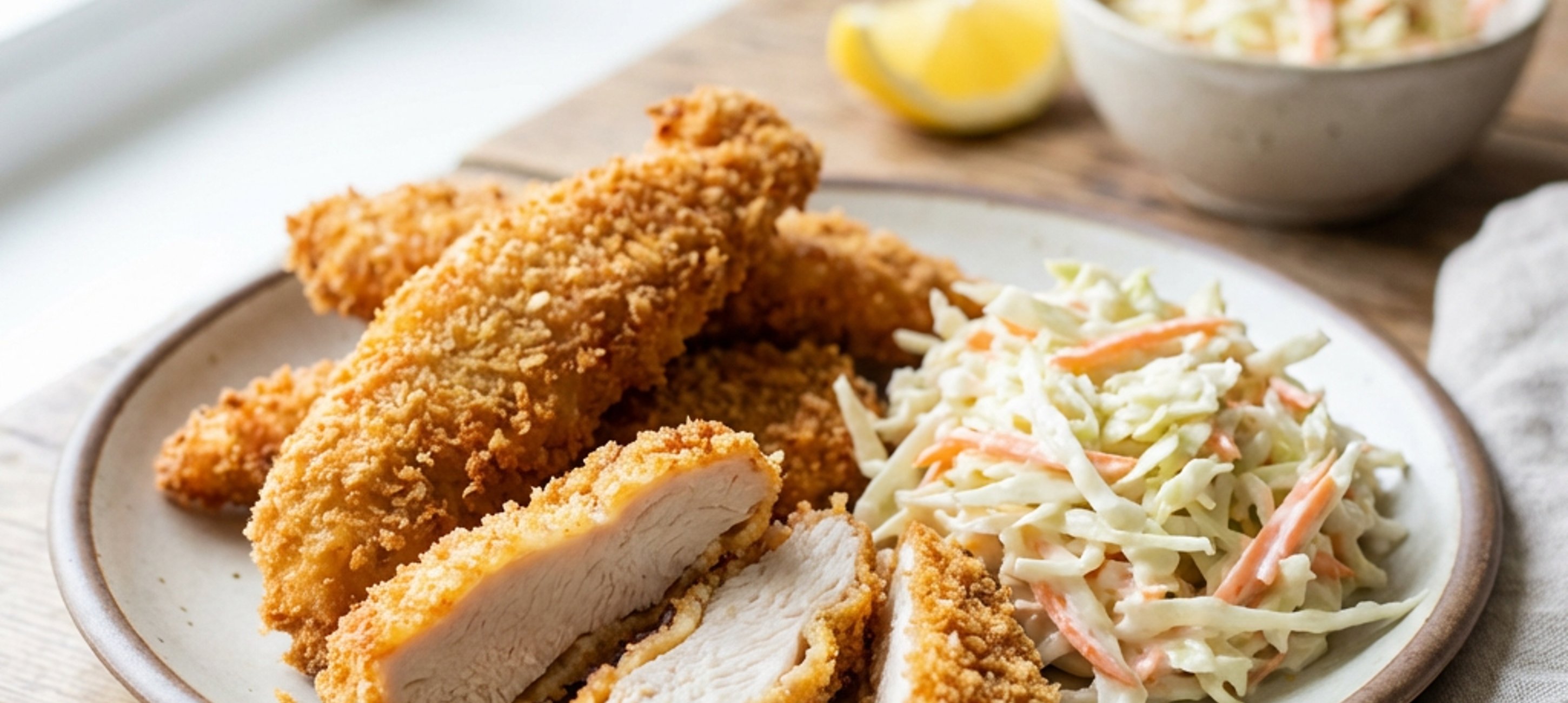 - 6Die knusprigen Hähnchen-Strips zusammen mit dem Coleslaw servieren.