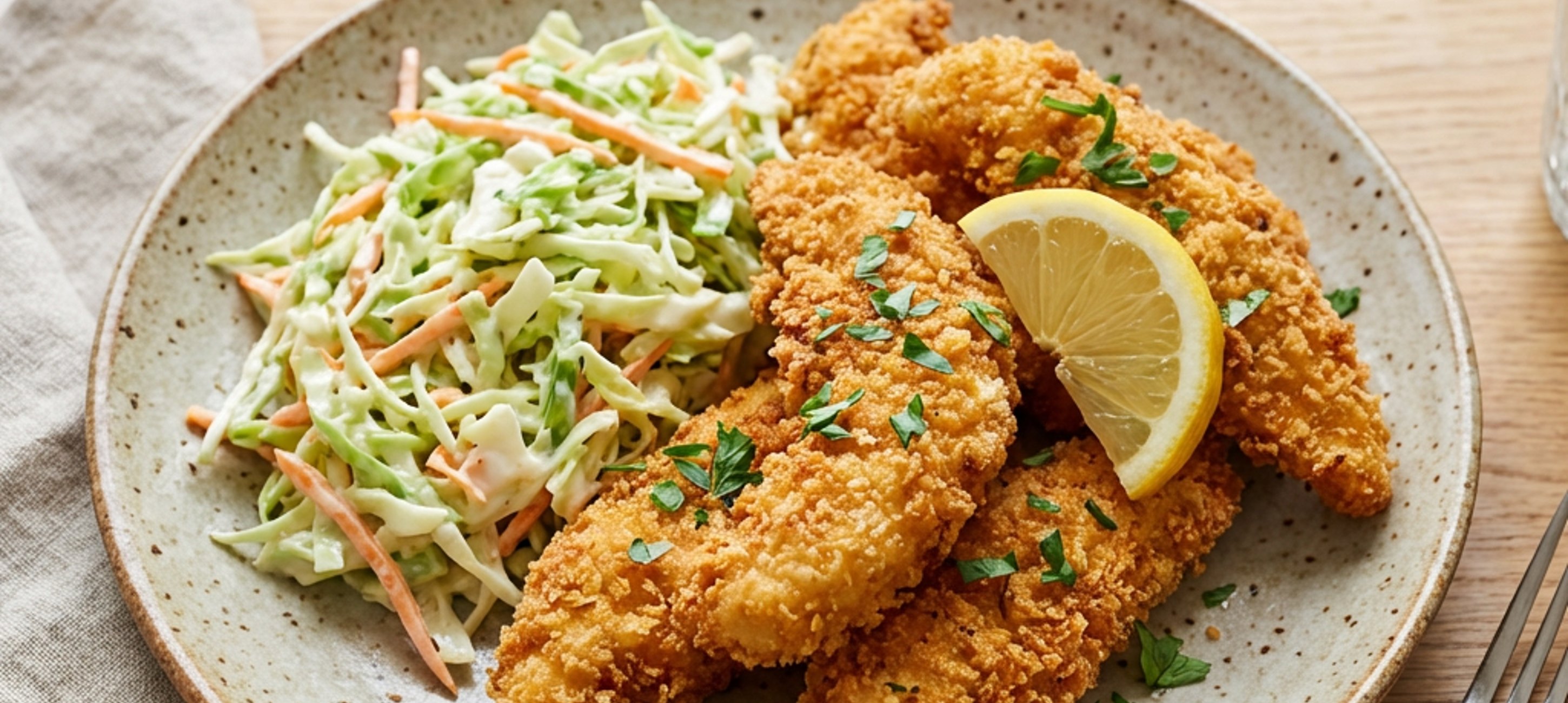 - 6In einer Pfanne reichlich Öl erhitzen und die Hähnchen-Strips darin bei mittlerer Hitze von beiden Seiten goldbraun und knusprig ausbacken. Auf Küchenpapier abtropfen lassen und zusammen mit dem Coleslaw servieren.