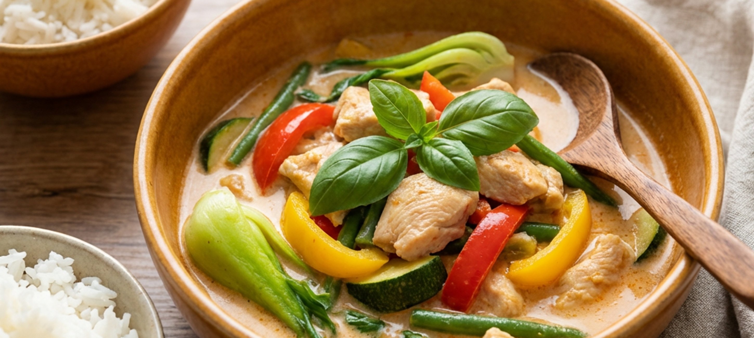- 5Vor dem Servieren das Zitronengras und die Kaffir-Limettenblätter entfernen, da diese nicht mitgegessen werden. Das Curry mit frischem Thai-Basilikum garnieren und zusammen mit dem Jasminreis servieren.
