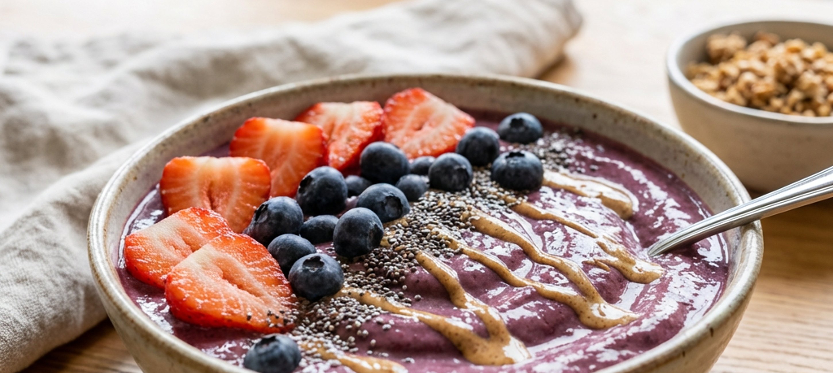 - 3Die Smoothie-Masse auf zwei Schüsseln verteilen. Mit frischen Beeren nach Wahl, Chiasamen und einem Klecks Mandelmus garnieren und sofort genießen.