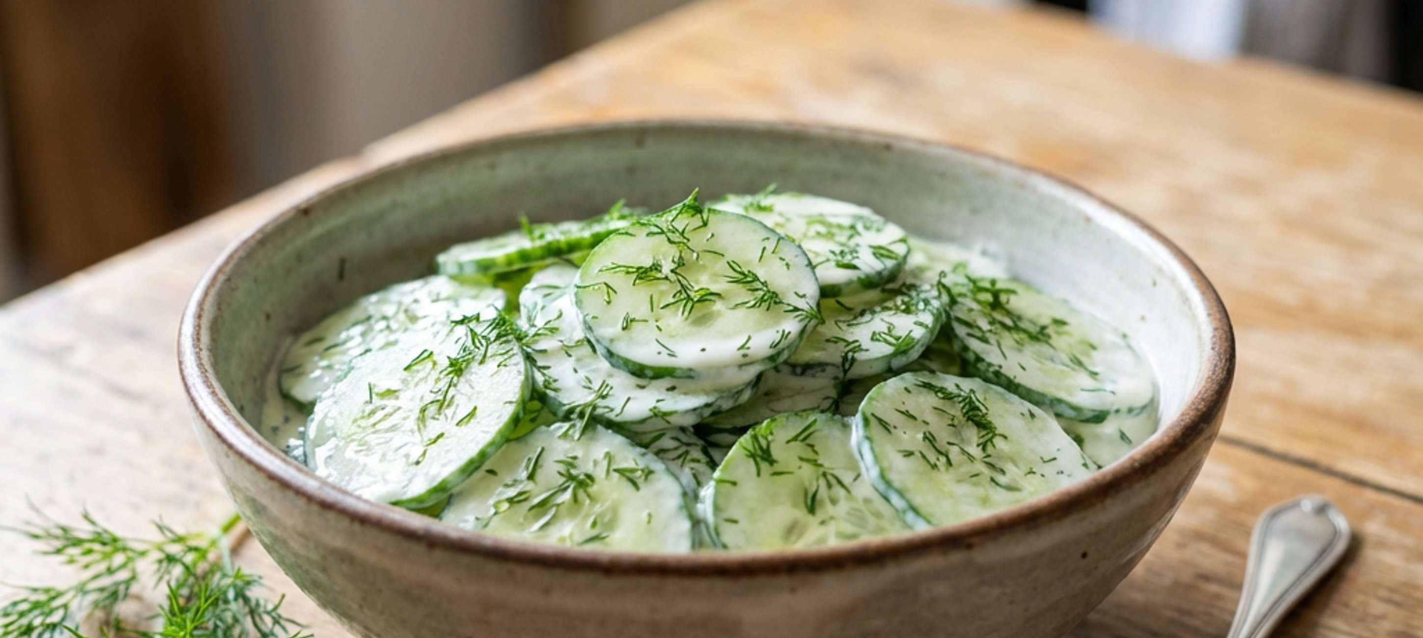 - 3Den frisch gehackten Dill unter das Dressing rühren. Die Gurkenscheiben hinzufügen und alles vorsichtig vermischen, sodass die Gurken gleichmäßig mit dem Dressing überzogen sind.