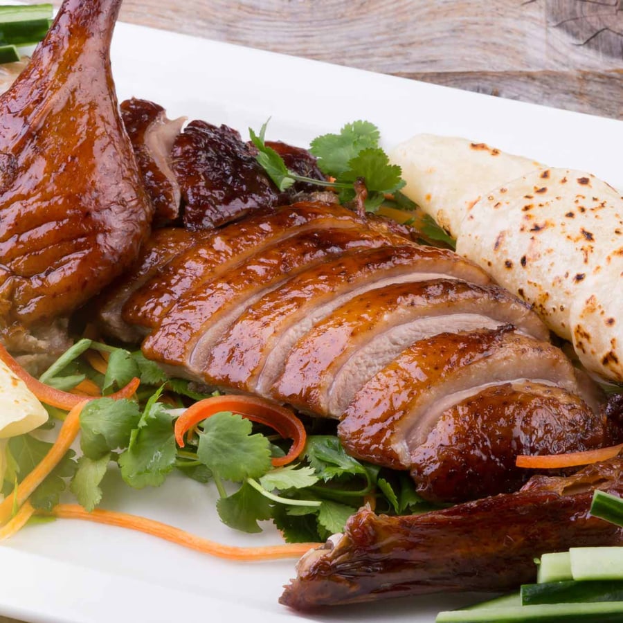 - 8Nach den weiteren 45 Backminuten die Ente mit der übrigen Honig-Paste bestreichen und erneut 15 Minuten bei 225 °C weiterbraten, um eine richtig schöne und knusprige Haut zu erhalten. Danach die Ente herausnehmen und etwas abkühlen lassen. Anschließend das Entenfleisch von den Knochen lösen, um alles in kleine mundgerechte Stücke zu schneiden. Diese mundgerechten Stücke mit den gekochten Gemüsestiften drapieren, mit den restlichen Möhren, Lauchzwiebeln sowie Koriander garnieren und gemeinsam mit den mit Barbecue-Soße bestrichenen Pfannkuchen servieren.
