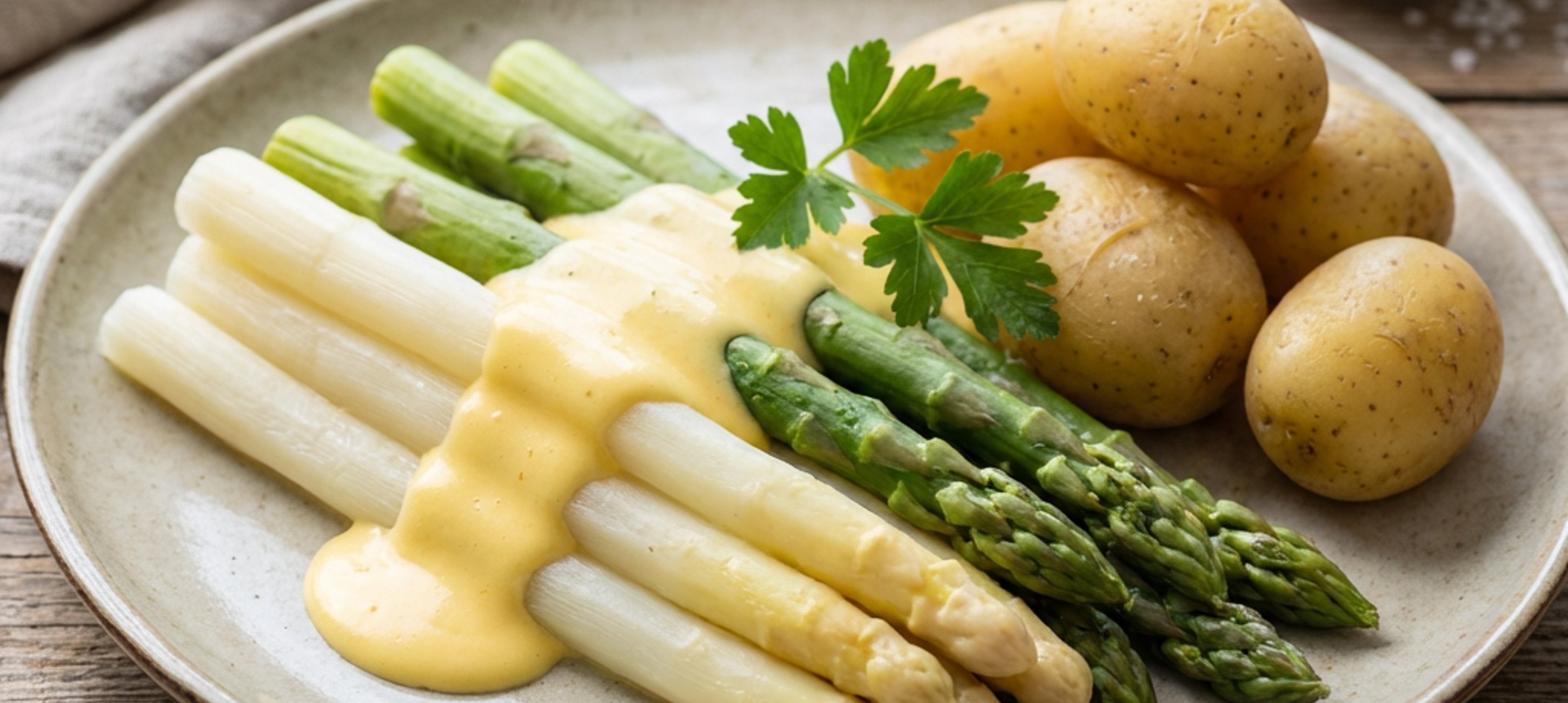 - 2In einem hohen Topf ca. 3 Liter Wasser mit Zucker und Salz zum Kochen bringen. Den Spargel hineinstellen: Den grünen Spargel ca. 5 Minuten, den weißen Spargel ca. 10 Minuten garen. Den fertigen Spargel vom Garn befreien und auf vorgewärmten Tellern anrichten. Mit einem Teil der Sauce Hollandaise übergießen. Den Rest der Sauce separat in einer Sauciere servieren.