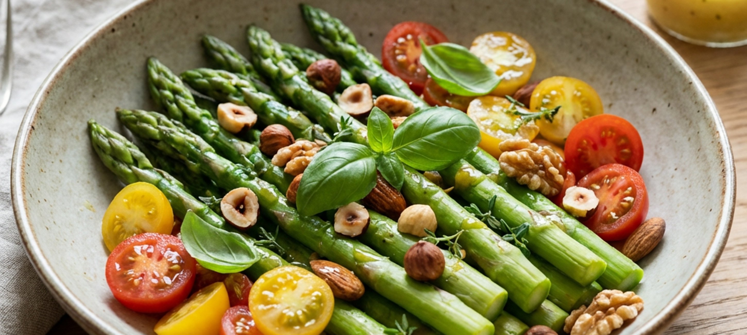 - 7Die abgekühlten Nüsse und Mandeln in einer Schüssel mit Rosinen, Cranberries, Olivenöl, Zitronensaft und Honig vermischen. Die vorbereiteten Tomaten und den Spargel hinzufügen. Mit einer Prise Salz abschmecken und vorsichtig vermengen.