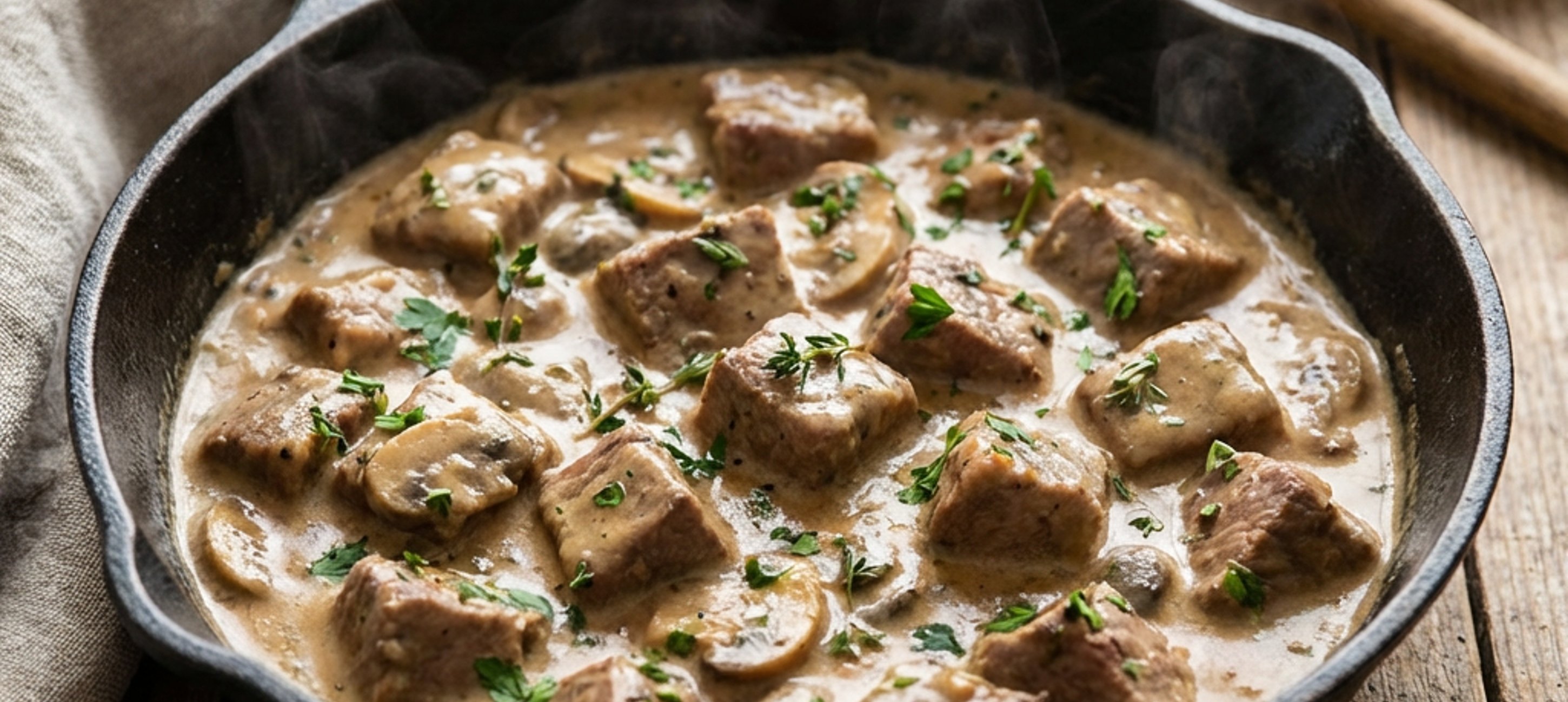 - 5Das Fleisch zurück in die Soße geben und bei geringer Hitze ca. 20-30 Minuten sanft köcheln lassen, bis das Fleisch zart ist. Zum Schluss die Sahne einrühren und die Soße nochmals kurz aufkochen lassen, bis sie die gewünschte Bindung hat. Die Kräuterzweige entfernen.