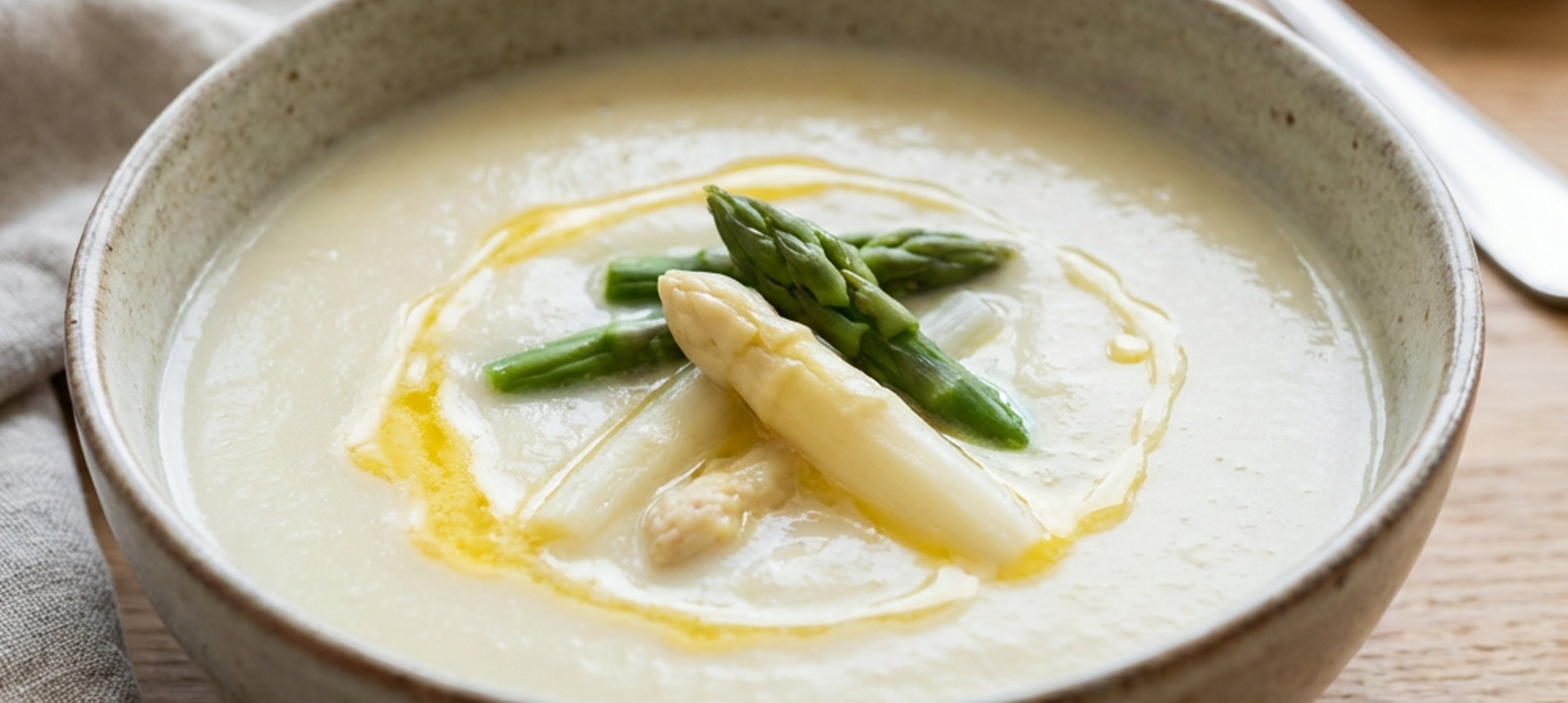 - 7Die erwärmten Spargelstücke zurück in die Suppe geben. Die Suppe auf Tellern anrichten und mit der restlichen Butter aus der Pfanne beträufeln. Tipp: Servieren Sie die Suppe nach Belieben mit knusprigen Croutons aus Weißbrot.