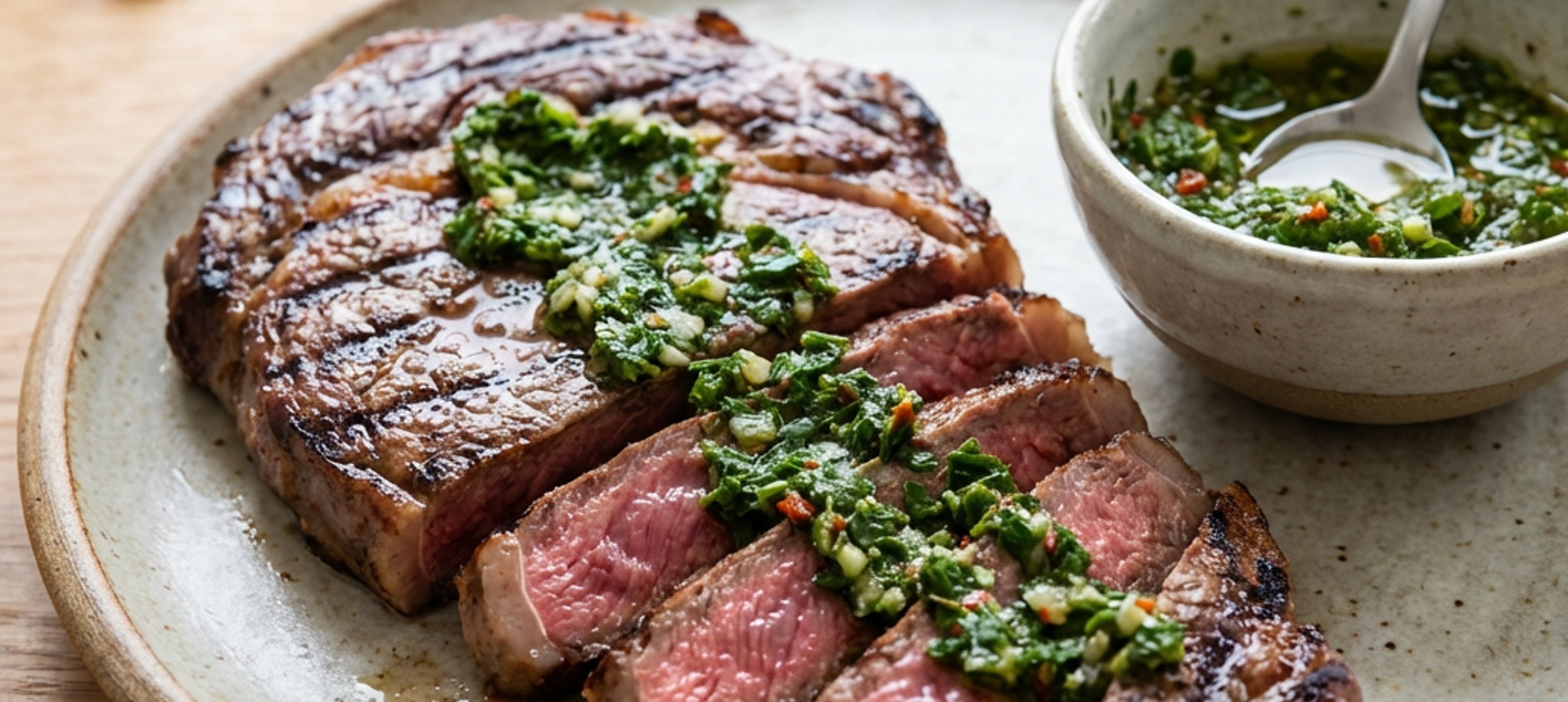 - 5Das ruhende Steak in Tranchen schneiden und großzügig mit der frischen Chimichurri-Sauce beträufelt servieren. Dazu passen hervorragend Röstkartoffeln oder ein frischer Blattsalat.