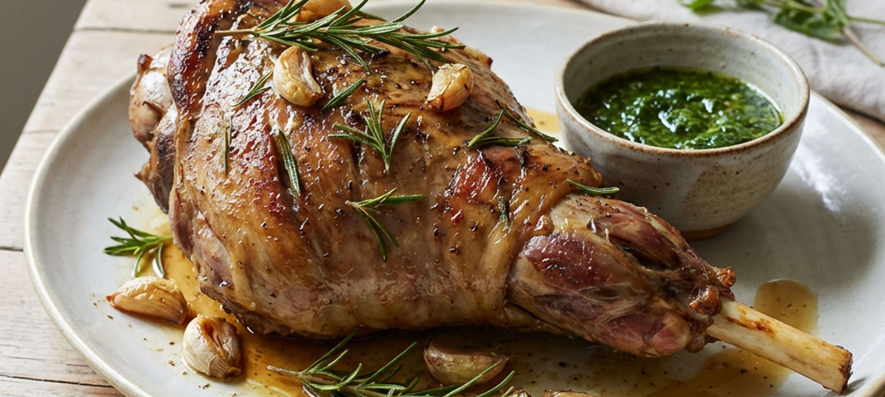 - 5Das Fleisch rundherum mit Rosmarin und Knoblauch spicken. Anschließend mit Olivenöl einreiben und großzügig mit Salz und Pfeffer würzen. Die vorbereitete Lammkeule in einen mit Backpapier ausgelegten Bräter legen. Im vorgeheizten Ofen ca. 2 Stunden garen, bis das Fleisch weich ist.