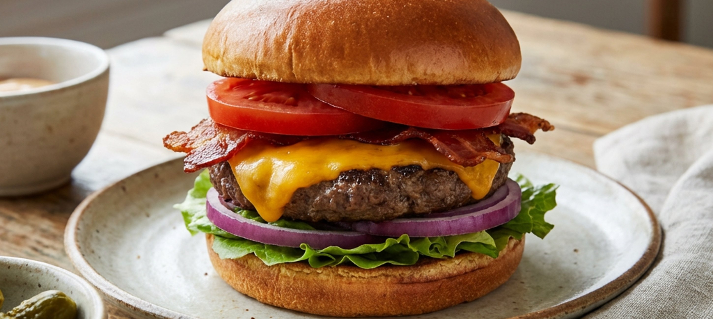 - 5Jede Brötchenhälfte mit 1 EL der gewürzten Mayonnaise bestreichen. Auf die untere Hälfte etwas Eisbergsalat und Tomatenscheiben legen. Darauf das Fleisch mit dem geschmolzenen Käse platzieren, gefolgt von weiteren Tomatenscheiben, dem knusprigen Bacon und den Zwiebelringen. Mit der oberen Brötchenhälfte abdecken.
