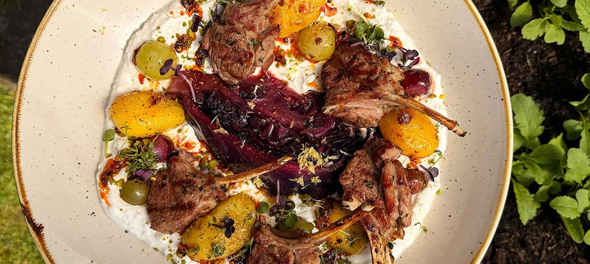 - 4Die Lammkrone scharf angrillen, bis die gewünschte Bräunung erreicht ist, dann bis zu einer Kerntemperatur von 52 Grad (Medium Rare) ziehen lassen.