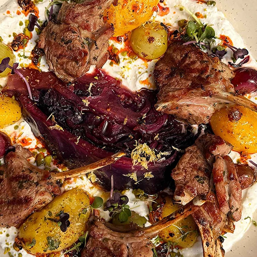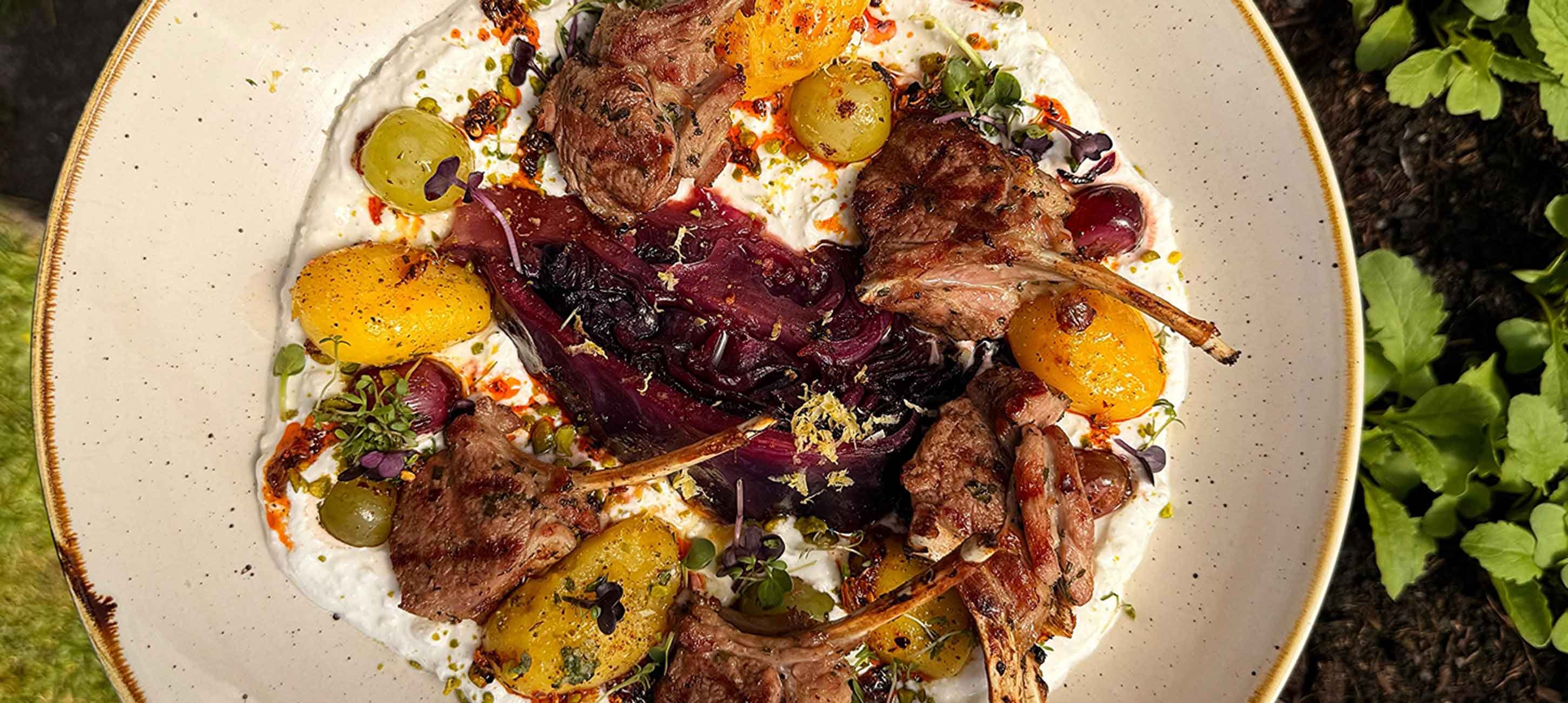 - 1Die Lammkrone zusammen mit den Rosmarinkartoffeln, dem geschmorten Rotkohl, den sautierten Trauben und einem Klecks Feta-Creme servieren.