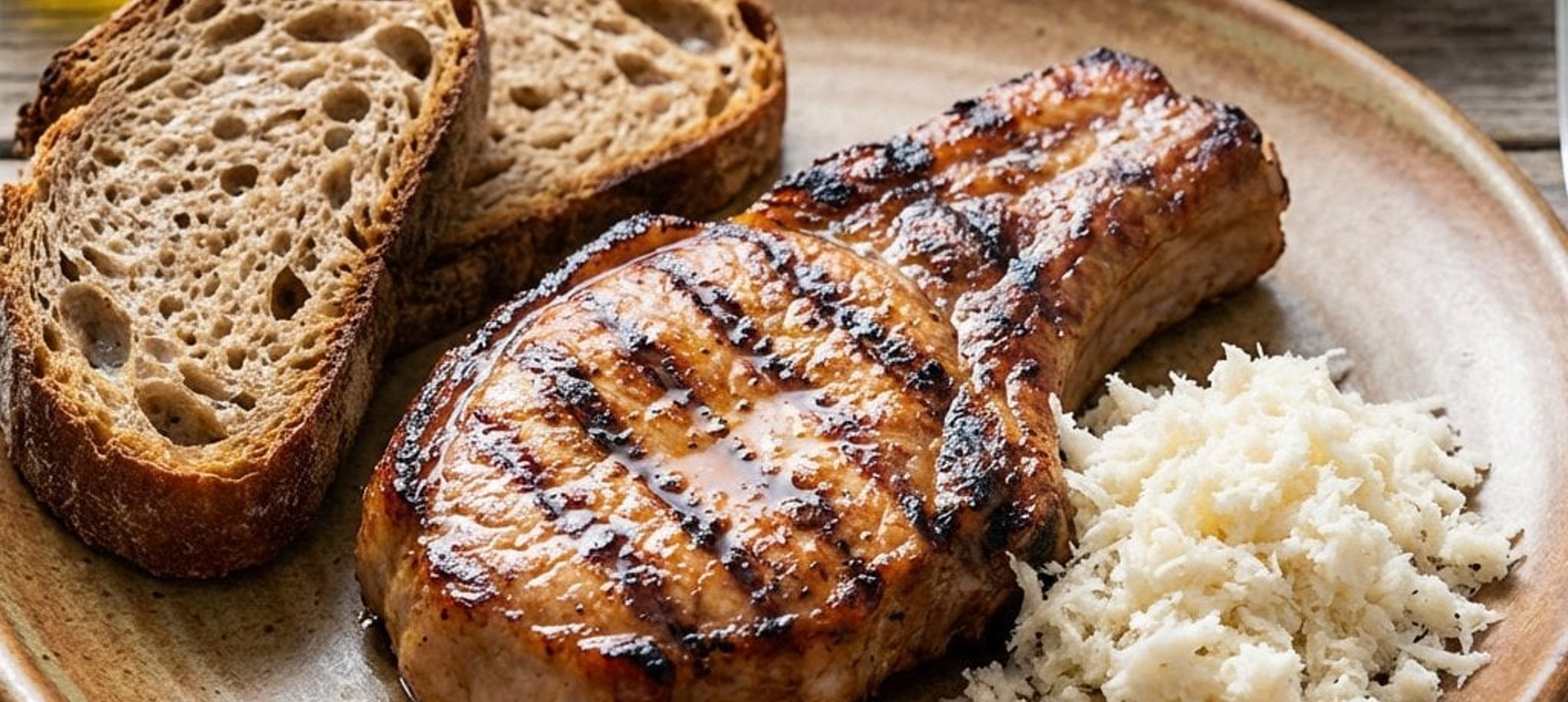 - 2Reiben Sie den frischen Meerrettich fein. Servieren Sie die heißen Koteletts zusammen mit dem frisch geriebenen Meerrettich und einer Scheibe rustikalem Bauernbrot.