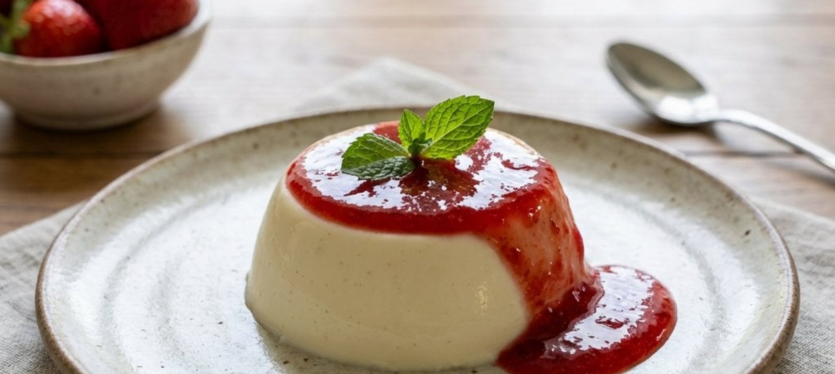 - 3Die Panna Cotta vorsichtig aus den Förmchen auf Teller stürzen. Die Erdbeeren mit der Sauce dazugeben und mit frischen Minzblättern garnieren.