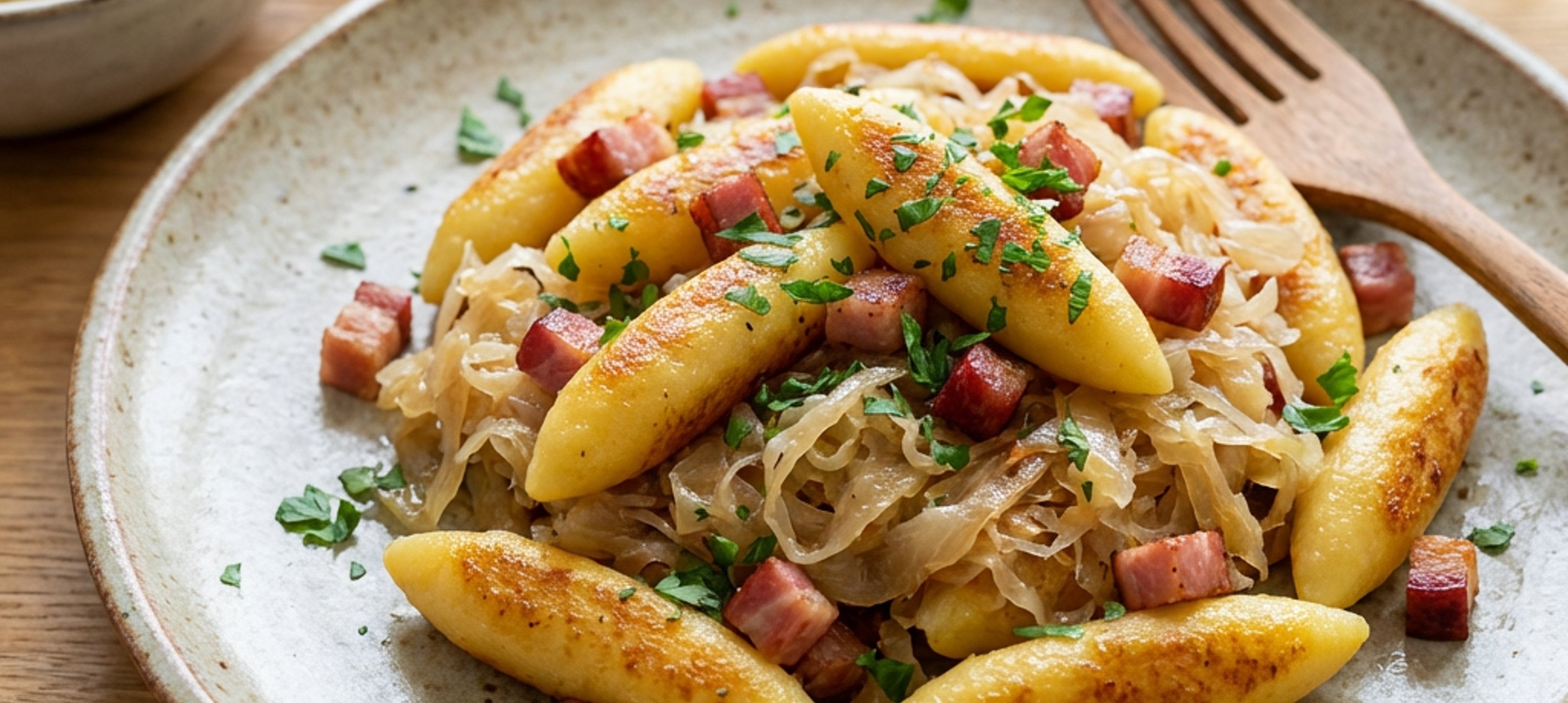 - 6Die Schupfnudeln am besten in einer separaten Pfanne in 2 EL Butterschmalz anbraten, damit sie schön kross werden. Die 100 Gramm Speck mit dazu geben und knusprig braten.