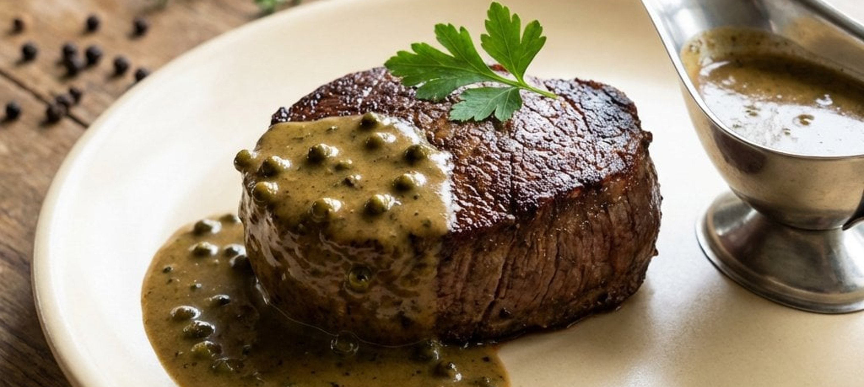 - 3Die Sauce kurz erwärmen. Die Steaks im geschmolzenen Buttersaft wenden und auf vorgewärmten Tellern anrichten. Mit etwas Sauce übergießen, den Rest separat servieren.