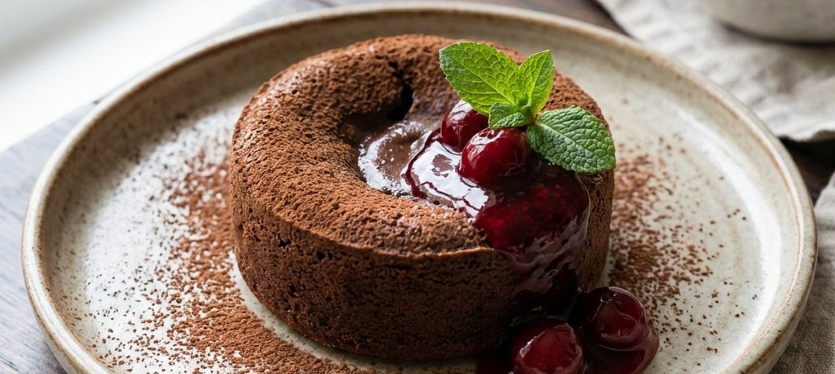 - 5Mit der Kirschsauce anrichten, leicht mit Puderzucker bestäuben und mit Minzblättern garnieren. Sofort servieren.