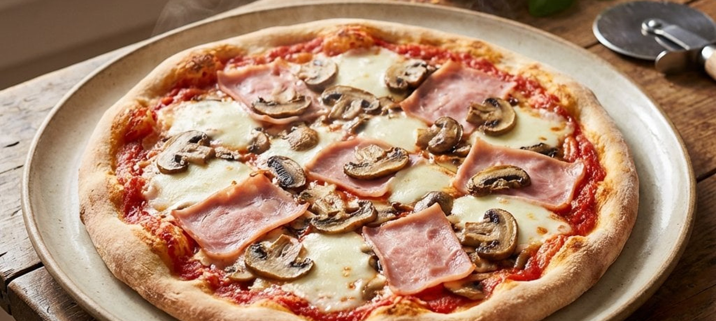 - 3Die Pizza mit Mozzarellascheiben belegen, dann den Kochschinken und die Champignons darauf verteilen. Zum Schluss mit dem restlichen Olivenöl beträufeln.